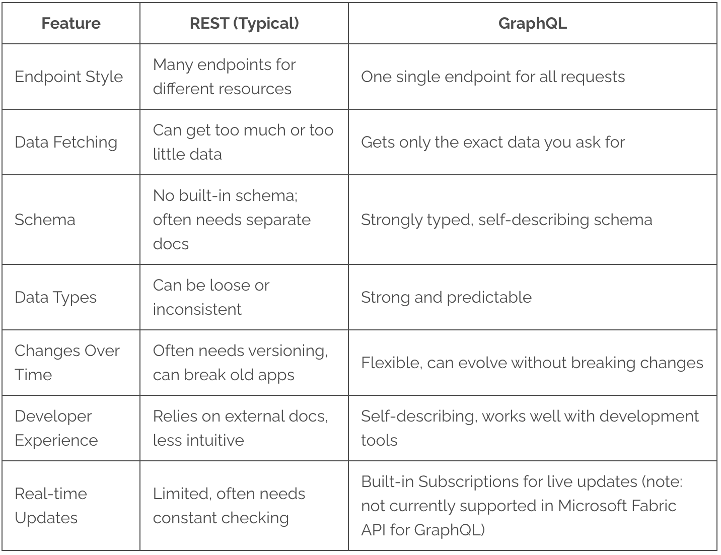 - Subscriptions: Enable real-time updates by notifying clients when data changes (note: not currently supported in Microsoft Fabric API for GraphQL).