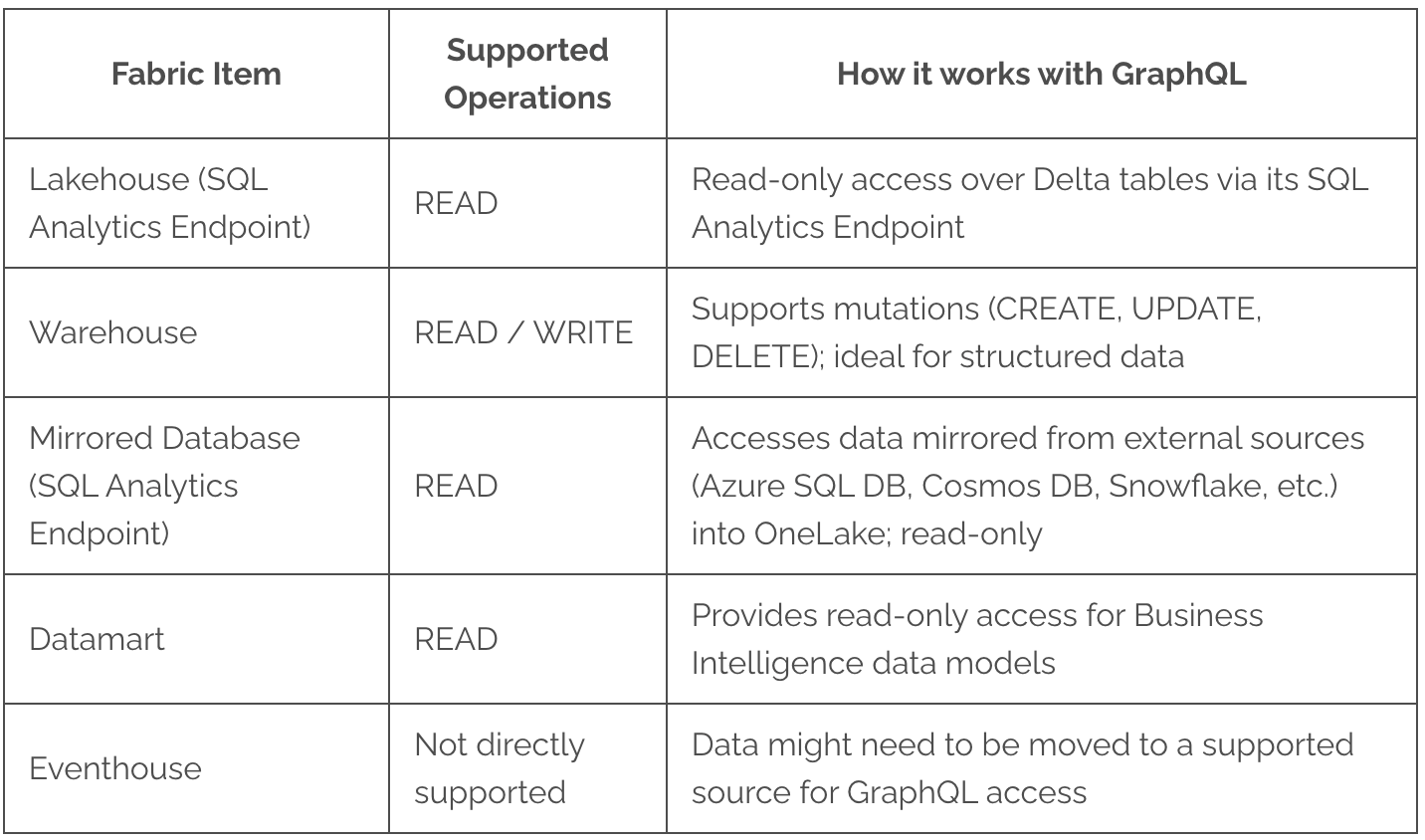 - Lakehouse (SQL Analytics Endpoint): Your Lakehouse data can be exposed for READ operations. The GraphQL API accesses it through its read-only SQL Analytics Endpoint, making your Delta tables available