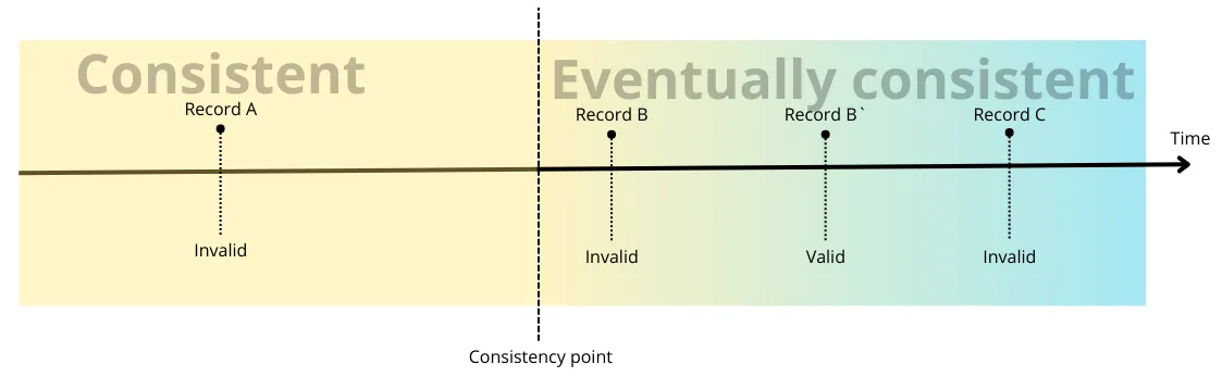 The picture below illustrates the temporary invalid state on the right side of the consistency point. Initially invalid, Record B becomes valid after an update (B’). In contrast, Record A, temporarily valid at the beginning, becomes invalid after reaching the consistency point due to the absence of updates within the expected time. Record C remains temporarily invalid throughout.