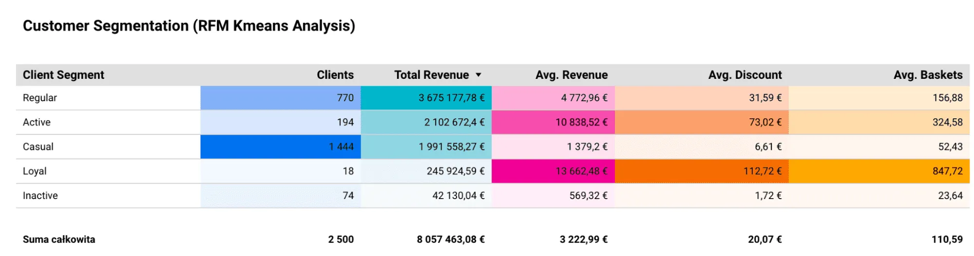 To prepare the visualization, we used Looker Studio, which is integrated with our platform. The table contains some basic metrics regarding revenue, average basket or discounts.