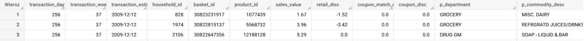 The data contains information about where and when the transaction took place, what was its value and details related to promotional campaigns.