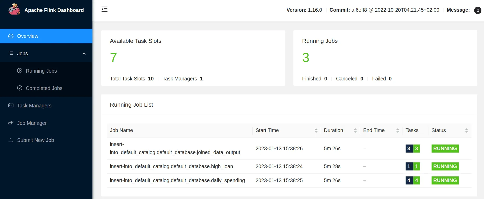 We can now open Flink UI http://localhost:8081/ and we should see 3 jobs deployed.