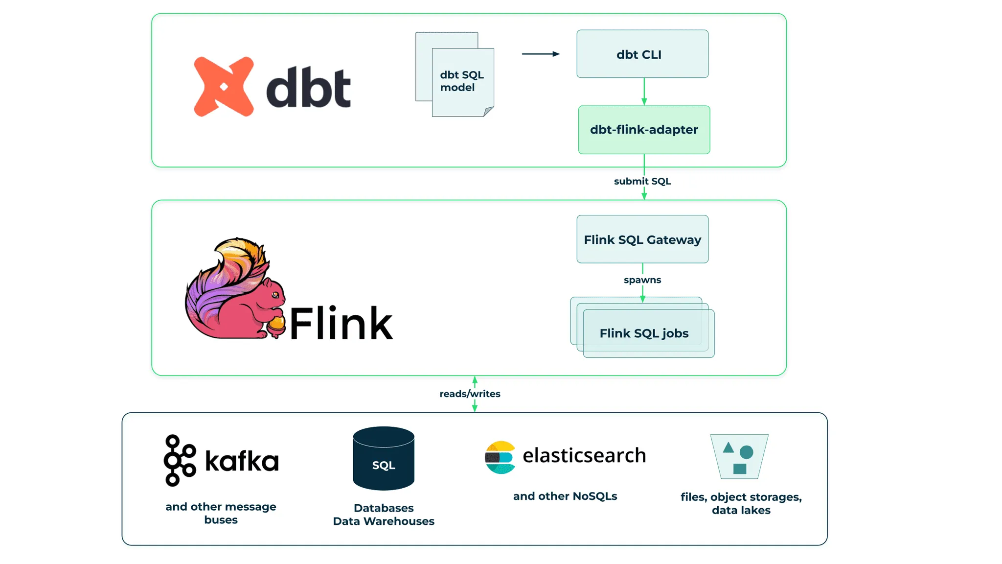 Here is a diagram that illustrates how dbt, Flink and other various storage services work together. As you can see, we leverage a very valuable new feature of Flink, called the Flink SQL Gateway, that provides API to execute SQL queries on a Flink cluster.