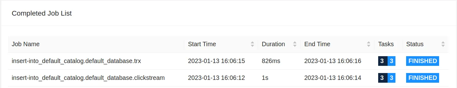 You can also notice in Flink UI 2 completed jobs that were used to insert data into Kafka topics.