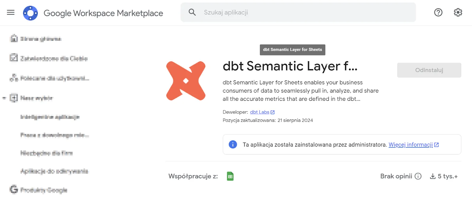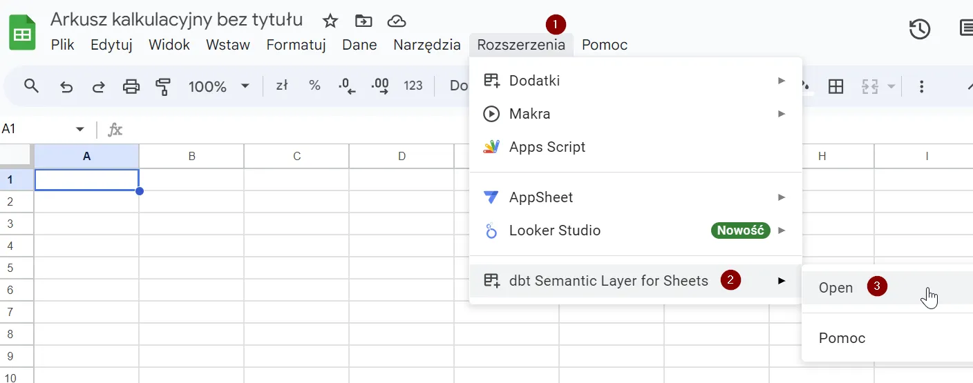 In order to use dbt SL in Google Sheets, you first need to add a new extension named “dbt Semantic Layer for Sheets” from Google Workspace Marketplace. If you cannot add it yourself, then you have to ask your Google Tenant Admin to install it in your organization. When this is done, then open the Google Sheets app and go to Extensions → dbt Semantic Layer for Sheets → Open.