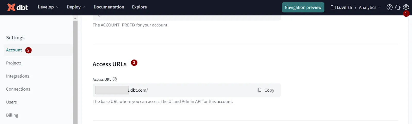 First, you need to get the URL under which your project is available. Go to Settings → Accounts → Access URLs and copy the value listed there (ending with …dbt.com/).