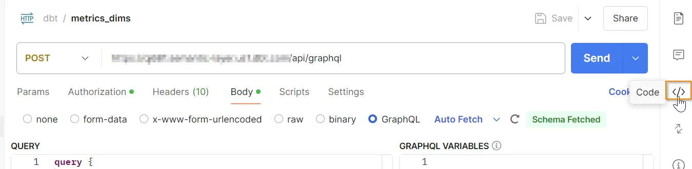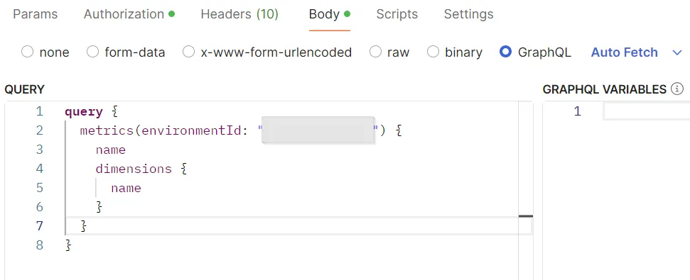 In the Body section define the type to be ‘GraphQL’ and paste the query you want to run in the Query section. Please see the documentation of using GraphQL API here.