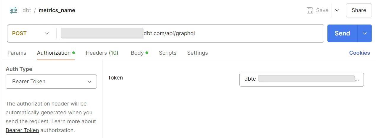 Open Postman and create a new POST request. Paste the Access URL to the URL section and add ‘/api/graphql’ at the end. Next, select Authorization to be ‘Bearer Token’ and paste the Service Token generated in dbt Cloud. In case you do not have one yet then please go to Settings, select “Service tokens” on the left panel and generate one there.