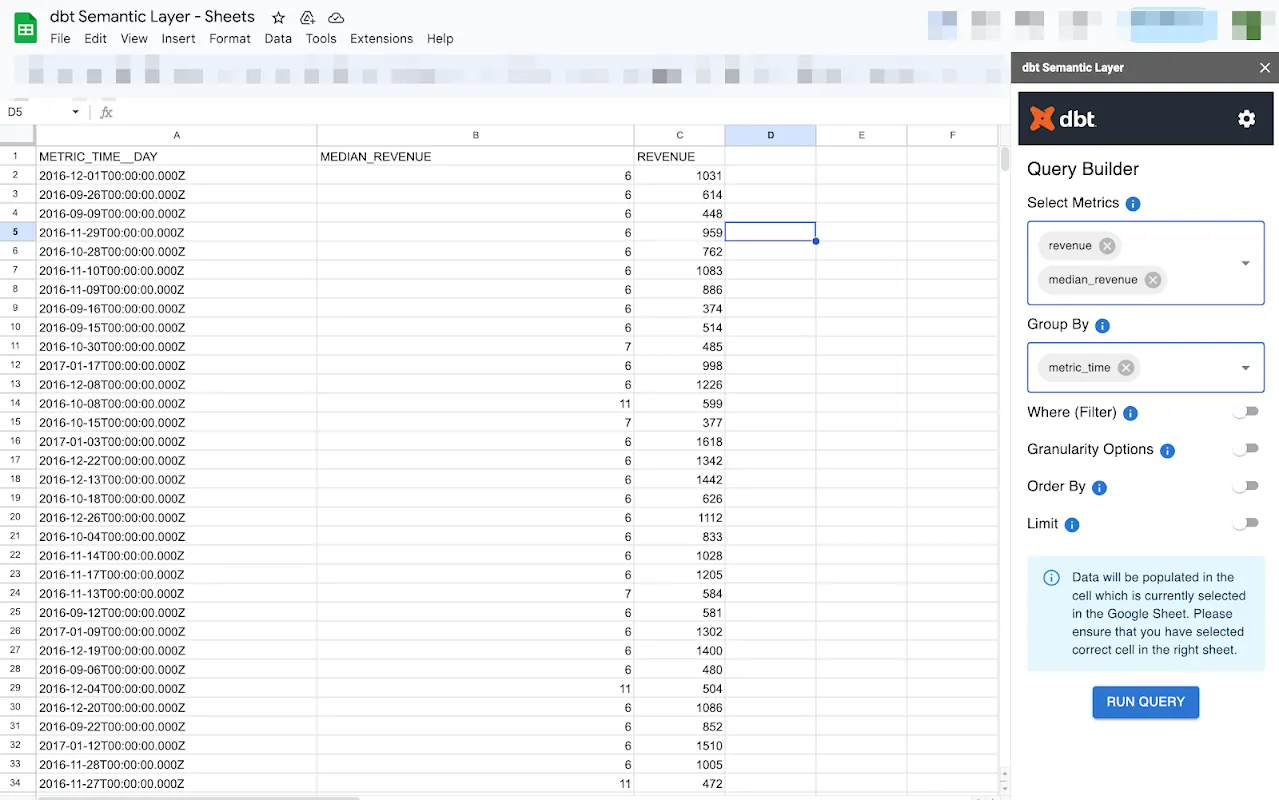 After connection to SL you will see the Query Builder where you can select data you want to see i.e. metric, grouping by, filtering etc. When you are done, click the Run Query button, and Google Sheets will request the data from dbt and present the output in the table.