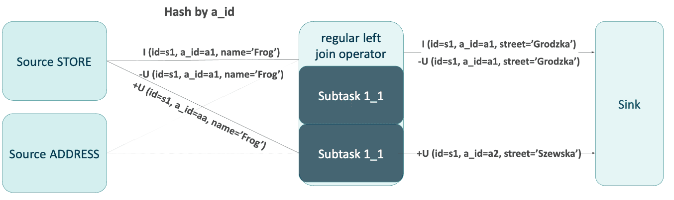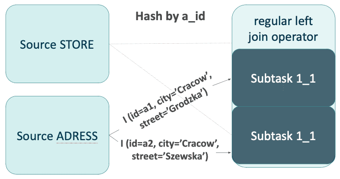 Let’s consider a regular one-to-one join between the STORE and ADDRESS tables, described by a simple query in FlinkSQL: