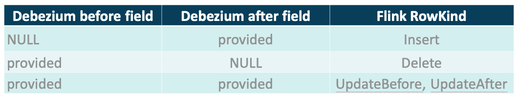 The Kafka connector supports the Debezium format for processing Change Data Capture events. Each message contains fields before and after, which are split by Flink into separate rows with proper types. All required information is provided within the message, enabling Flink to create a changelog using simple transformations. This operation is fast and does not require ChangelogNormalize or any other stateful operator. The rules of the transformation are listed in the table below.