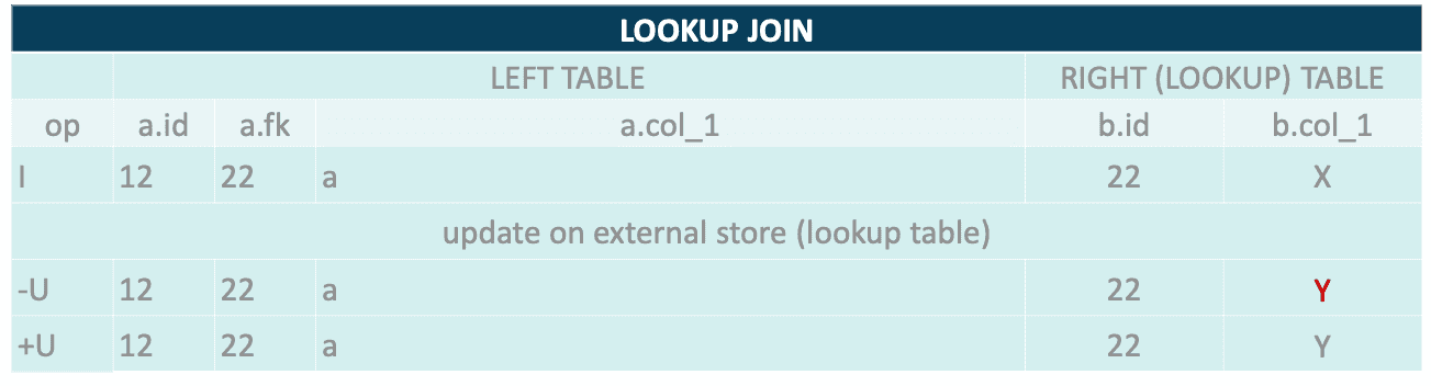 The lookup join also doesn’t generate the correct changelog. It’s a stateless operator and cannot keep track of previous values. The UpdateBefore event will have the same values as UpdateAfter. Similarly, it may lead to data corruption if you add a regular join operator based on the values from a lookup table.