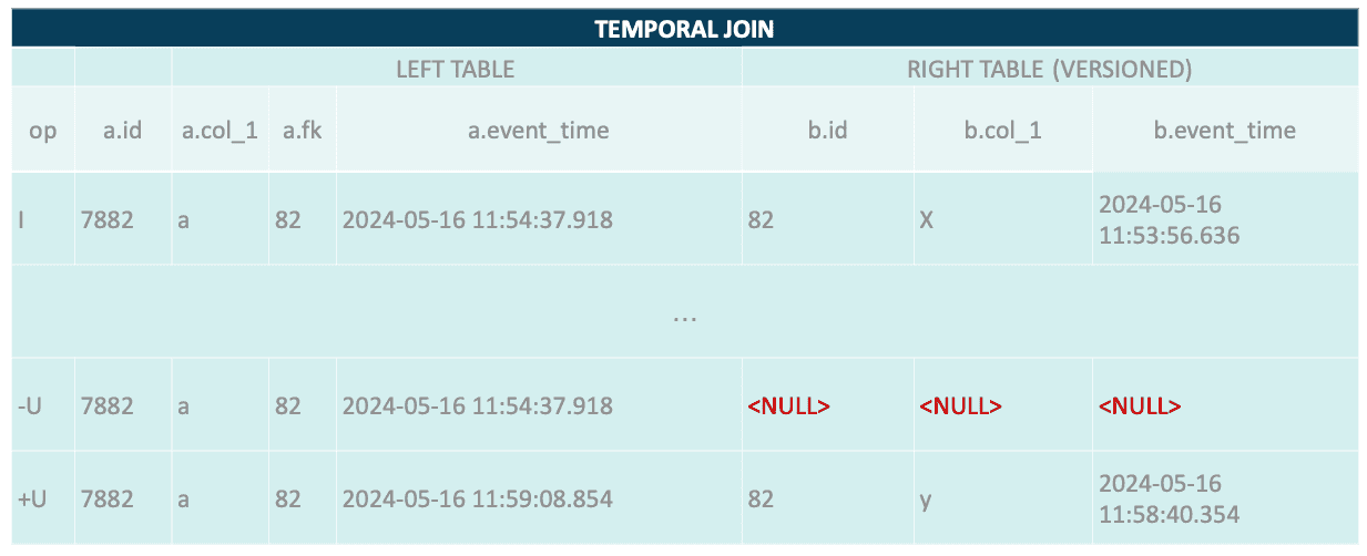 What happened? Why are the right-side values null? The temporal join operator keeps the latest version of the row. It doesn’t know what the previous value is, so the UpdateBefore event is incomplete. This may affect the Sink Materializer, as it may not be able to match the retract with the previous version.