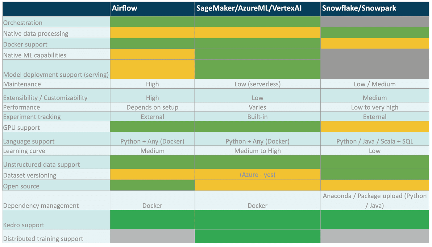 Alternatively, one can only use Snowflake in a data-centric way and offload the machine learning pipeline orchestration and training to external systems such as Azure ML, Vertex AI or SageMaker. By doing so, a trade-off will be introduced — some of the ML/AI-native capabilities of the external services could potentially be leveraged, while the data transfer and cross-cloud connection/setup costs may appear. Such an approach may be, however, desirable in some cases when there is a need to reuse an external pipeline orchestrator service that is already used in organizations, such as Apache Airflow.