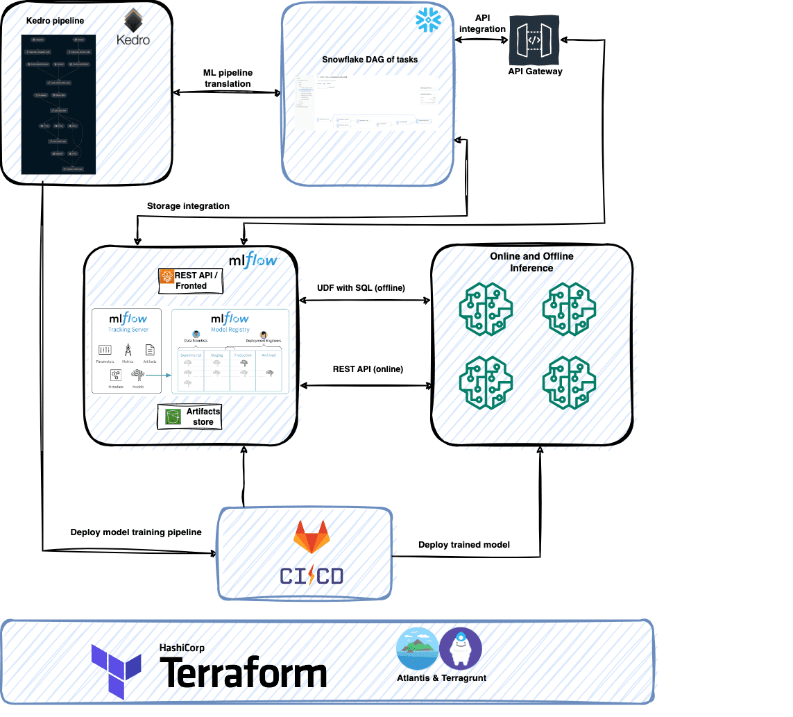 In this condensed blog post we presented our approach to architecting a cloud-agnostic MLOps platform on top of Snowflake Data Cloud, based on three building blocks: Kedro, MLflow and Terraform.The proposed solution solves the issue of missing external access to third party services in the Snowflake ecosystem — this feature once implemented, would simplify the overall architecture by removing the need of using external function wrappers and API gateways.