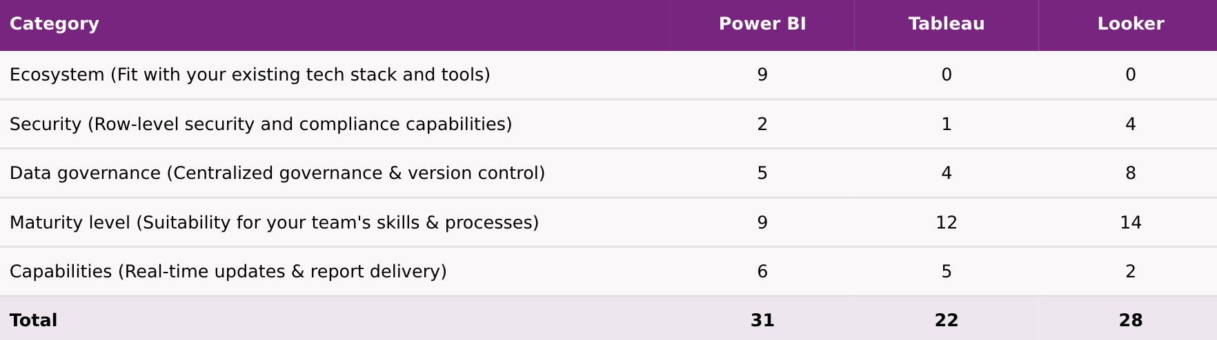 Next, we explore how the three leading BI tools—Power BI, Tableau, and Looker—align with your specific setup. The rules engine uses your input to assign points across our five categories of ecosystem fit, security capabilities, data governance, team maturity alignment, and feature capabilities. We present the scoring alongside qualitative analysis of each tool's pros and cons in your specific context.