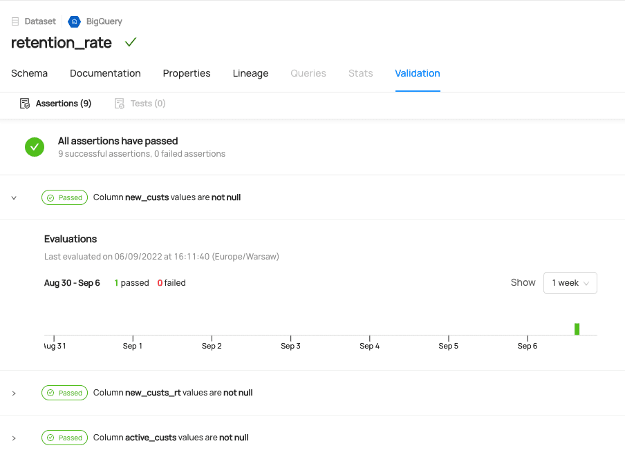 Data quality tests are defined and validated at the time of development. In case any discrepancies occur, an alert is sent on a dedicated Slack channel. Moreover, the history of data quality checks is available via a data catalog. You can also leverage its lineage functionality to troubleshoot issues in your data pipelines.