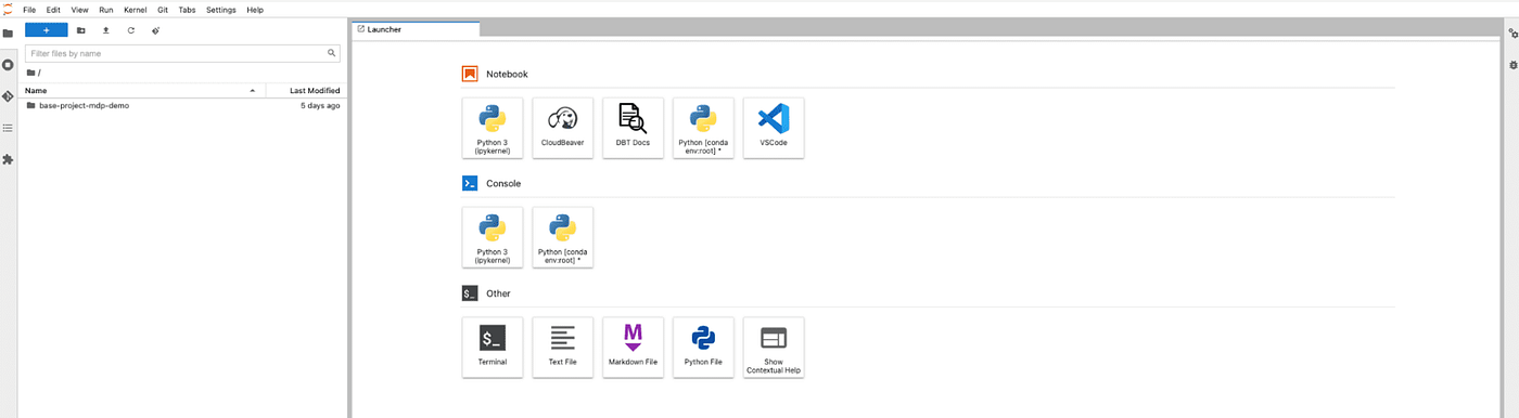One of the icons in the GID Portal is the actual user’s playground, with access to all the data wrangling tools — GID MDP Workbench (here utilizing Vertex AI on GCP). From here, the user can explore the data using Cloud Beaver, access the VSCode IDE for data transformation definitions in dbt or manage the whole pipeline via data-pipelines-CLI in the terminal.