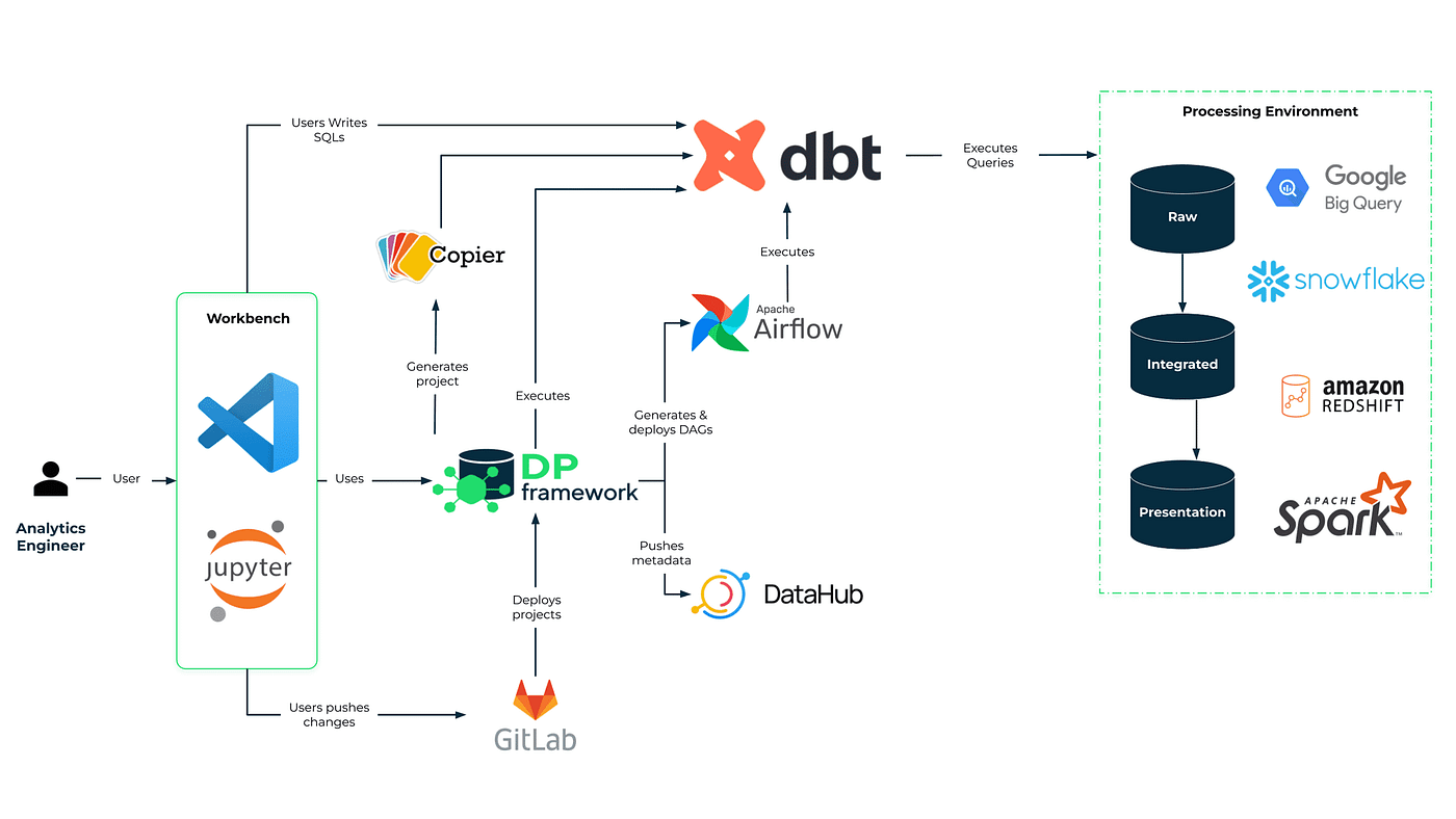 In order to deliver all the above-mentioned functionalities, we came up with a framework consisting of tools, configurations, standards and integration packages that would secure the seamless integration of the components of our stack and provide a user-friendly interface. One of our key framework components is a data-pipelines-CLI package that covers the technical complexities of data pipeline management behind a user-friendly interface. It also simplifies the automation of transformations, deployments and communication between different tools in a modern data stack. Another package that came in handy is dbt-airflow-factorywhich helps with the integration of transformation and scheduling features. Thanks to this package, dbt and Airflow artifacts are effortlessly and automatically translated at runtime, providing the user with a single place to define the data processing logic. Both packages were built and open sourced in our R&D DataOps Labs. Feedback and contributions are very welcome!