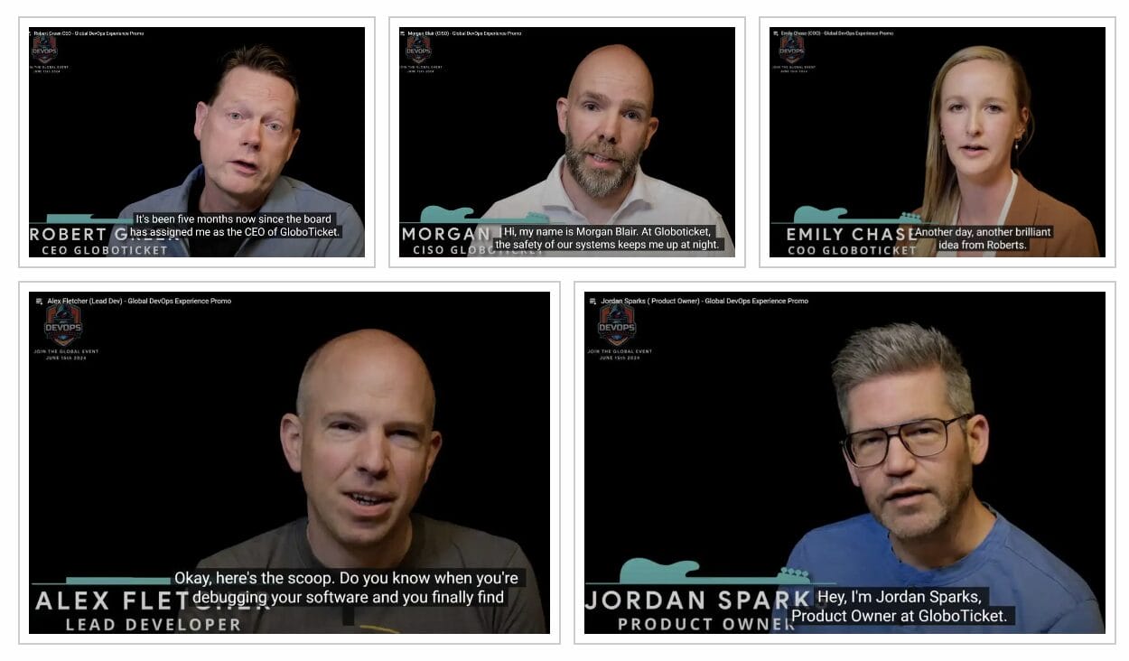 Die Bühne war also klar: Globoticket. Aber dann brauchten wir einige Akteure. Die Probleme, die wir lösen wollen, und das WARUM hinter diesen Problemen... Wer würde diese Probleme in einem Unternehmen bewältigen? Na klar! Ein CEO mit einer Vision, ein COO, der dafür sorgen muss, dass es funktioniert, ein CISO, der sich um die Sicherheit kümmert, ein Product Owner, der dafür sorgen muss, dass es funktioniert, und ein Lead Developer, der dabei helfen muss, es aufzubauen. Und natürlich die Hauptakteure: die Leute aus unserer Community - Plattformingenieure, DevOps-Ingenieure, Entwickler usw. -, die lernen wollen und während des Veranstaltungstages die Hauptrolle spielen können, um tatsächlich das zu bauen, was wir uns vorgestellt haben.